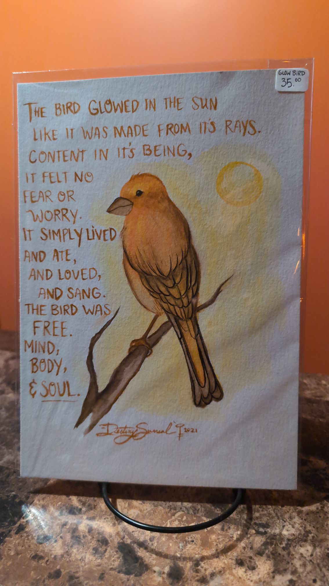 The beautiful “Glow Bird” of good will and freedom. The artist paints a simple and intriguing story for a bird in the sun with a positive poem as a reminder of peace.