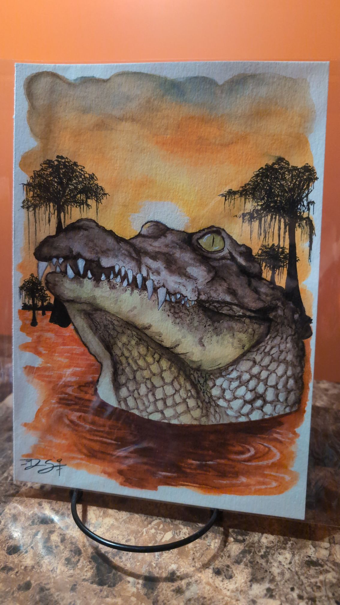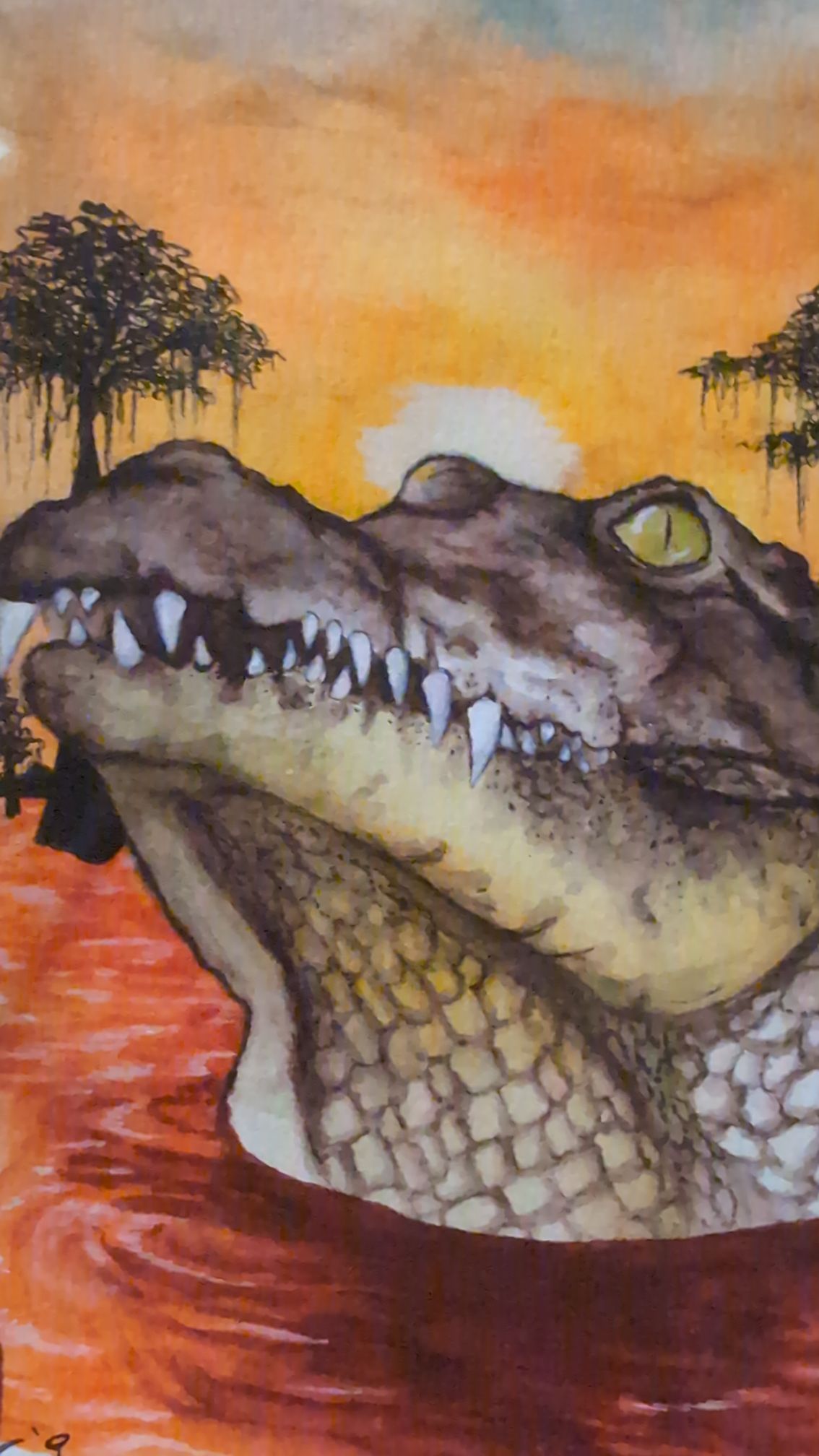 “October Swim” is a look into lowcountry life in the swamp lands of South Carolina. An inspiring look from the artists point of view. A take of coastal nature in the fall and the Alligator spirit representing patience, resilience, and observance. We get a view of an animal that may look ominous in nature with rich reddish orange tones, but a also a sense of calm in the water against sunlight.